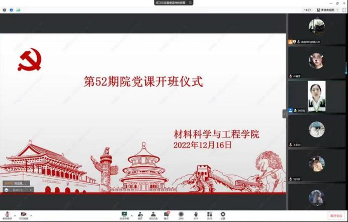 材院网讯(通讯员 张晓君)材料学院第52期党课学员在线上进行党课培训,于2022年12月16日在线上开展开班仪式。由党委副书记刘永帆,第二学生党支部书记兼组织员张晓君老师,第一学生党支部书记李爽老师、分别对本期学员讲授党课。此次党课培训围绕教育如何做一名合格的大学生党员及学习发挥先锋模范作用,使党员同学们奋进正当时,更加深刻的领悟党的思想。