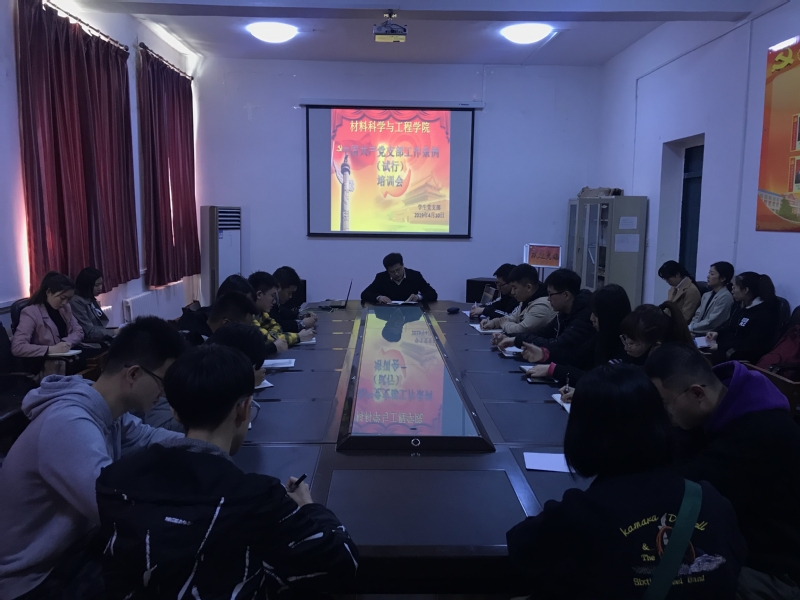2019年4月4日,材料科工程学院学生党支部在材料楼五楼召开中国共产党工作条例(实行)培训会,会议由学生党支部书记万杨主持,全体学生党员参加会议。