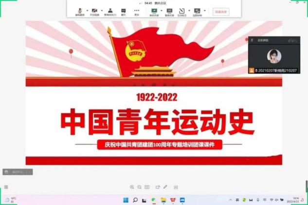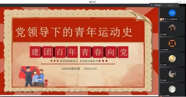 2022年史党的二十大召开之年,也是建团100周年。200205团支部于2022年4月23日下午13点在腾讯会议开展了党领导下的青年运动史主题团课学习。
