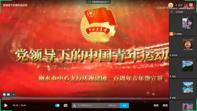视频结束后,由刘达权,高忠义,谢燚3位同学发言,详细介绍了青年运动史中的早期青年团组织的诞生,中国社会主义青年团的创建,青年抗日救亡组织在反侵略战争中成长三个专题。同时邀请了陈晨发言,讲述了对此介绍的党领导下的青年运动史专题的感悟:在中国共产党直接领导下,中国共产主义青年团成立。100年栉风沐雨,共青团始终坚定不移跟党走,团结带领共青团员和广大青年前赴后继、勇当先锋,书写了中国青年运动的华章。