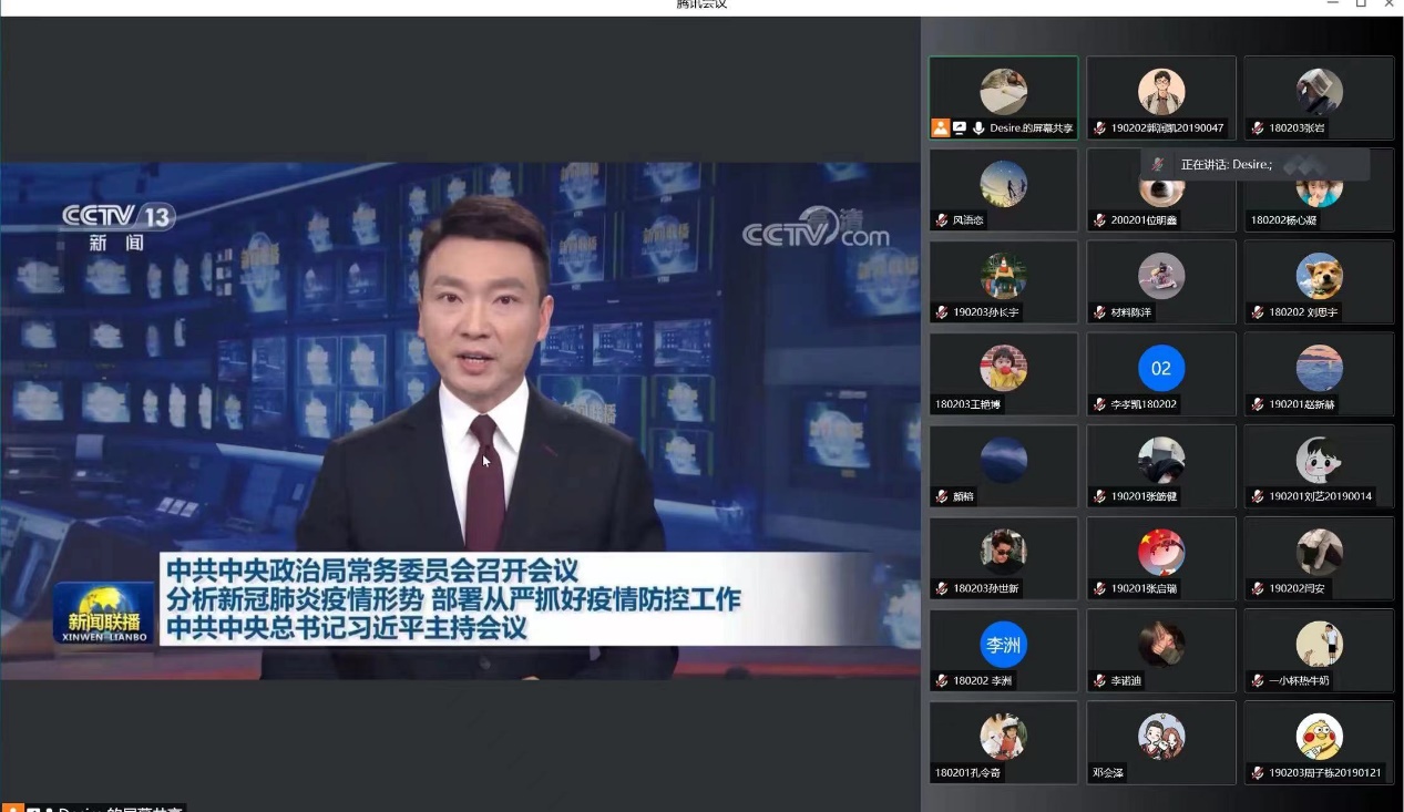 首先,学院学生第一、第二党支部全体党员共同观看了中共中央政治局常务委员会召开,中共中央总书记习近平主持的会议,此次会议分析了新冠肺炎疫情形势部署,要从严抓好疫情防控工作。