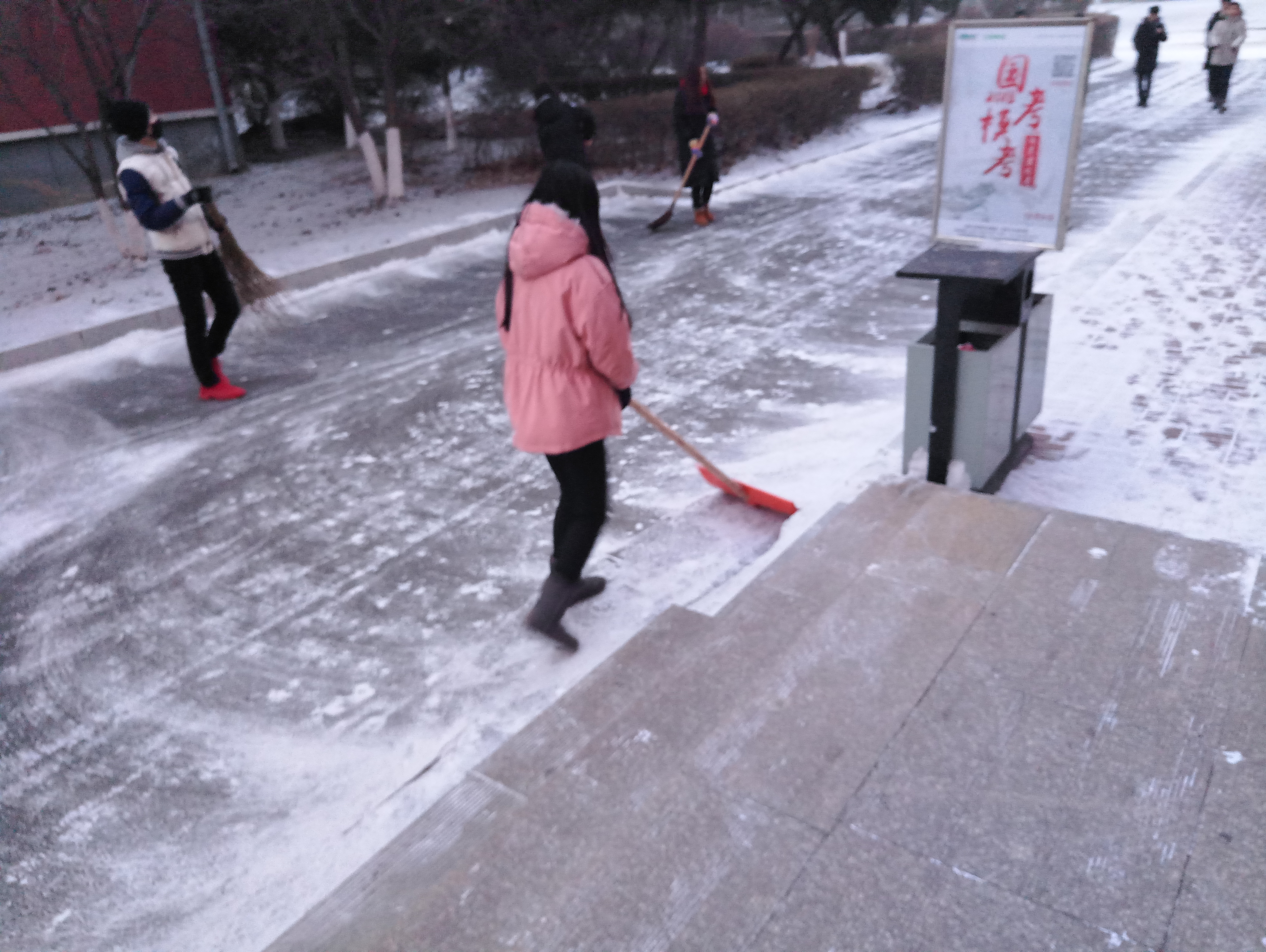 在寒冷的环境中,大家团结协作,不畏严寒,有序的清理道路积雪。他们有的挥舞铁锨,铲冰除雪,有的手拿扫帚,清扫路面,经过两个多小时的奋力打扫,道路上的积雪情况得到缓解,及时保证了校园道路的安全畅通,为同学们的生活与安全出行带来了便捷,同时清扫了学校的主楼门前,为学校的面貌加分。