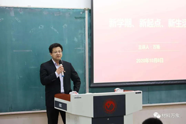 的教学环境,师资力量,对材料学院各个专业进行了深刻的阐述,讲解了就业的大方向,培养学生的爱校情怀。第二点是如何读大学。万杨老师鼓励学生树立理想和目标,介绍了大学生活的形态,强调了学习是学生的天职,让同学们不要放弃学习。最后万杨老师给同学们提了几点关于以后大学生活的建议。
