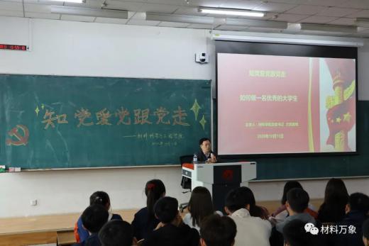 在西区302教室,由党委书记兰民作“知党爱党跟党走”主题报告会,就如何做一个大学生展开报告。