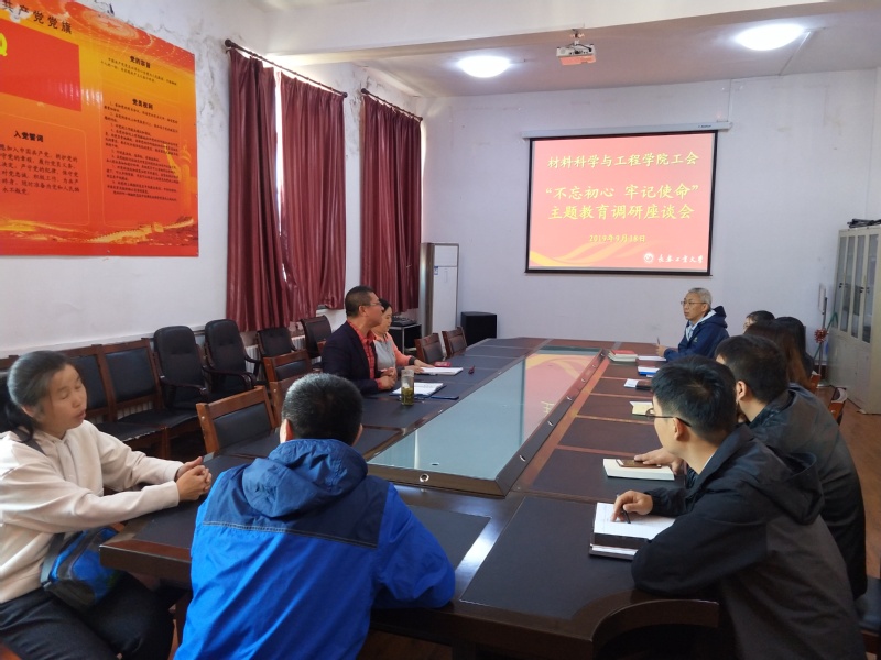 本网讯(通讯员万杨)高清无码 工会于2019年9月19日在材料楼五楼会议室召开“不忘初心 牢记使命”主题教育调研座谈会,会议由学院工会主席吴文东主持,学院各工会小组长、部分教师代表参加了座谈会。