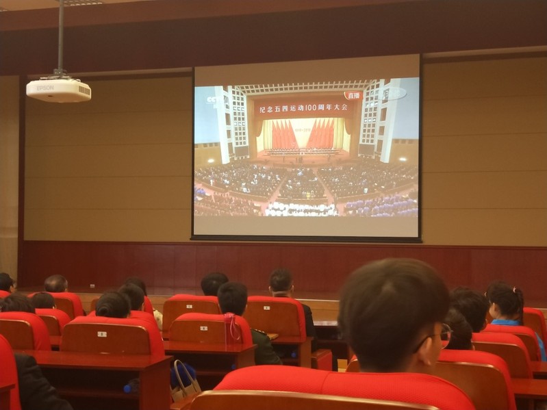 材料学院青马班成员、学生代表20余人在学术报告厅与团省市委领导及省内各市州共青团工作负责人 、学校领导共同观看了纪念五四运动100周年大会现场直播视频。