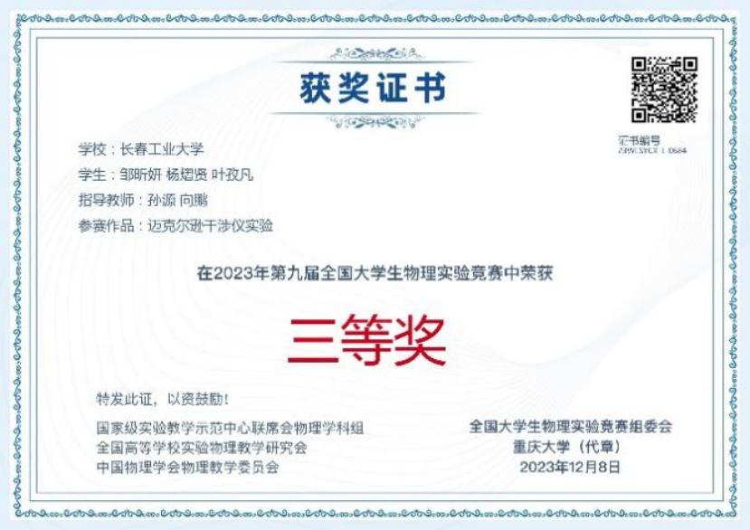 基础物理教学部的孙正昊老师带队,共四支学生队伍参加了此次竞赛。虽然我校师生首次参加该项赛事,但参赛的指导教师和团队同学们以饱满的热情和严谨的态度投入到比赛中,荣获国家级三等奖一项,优秀奖三项。其中孙源、向鹏两位老师指导,邹昕妍、杨熠贤、叶孜凡团队的参赛作品《迈克尔逊干涉仪实验》获得本次大赛三等奖。