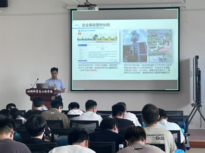 在材料楼417会议室举行了2024年度研究生实验室安全培训考核会,学院副院长李于朋主讲,全体研二和博二同学参加。
