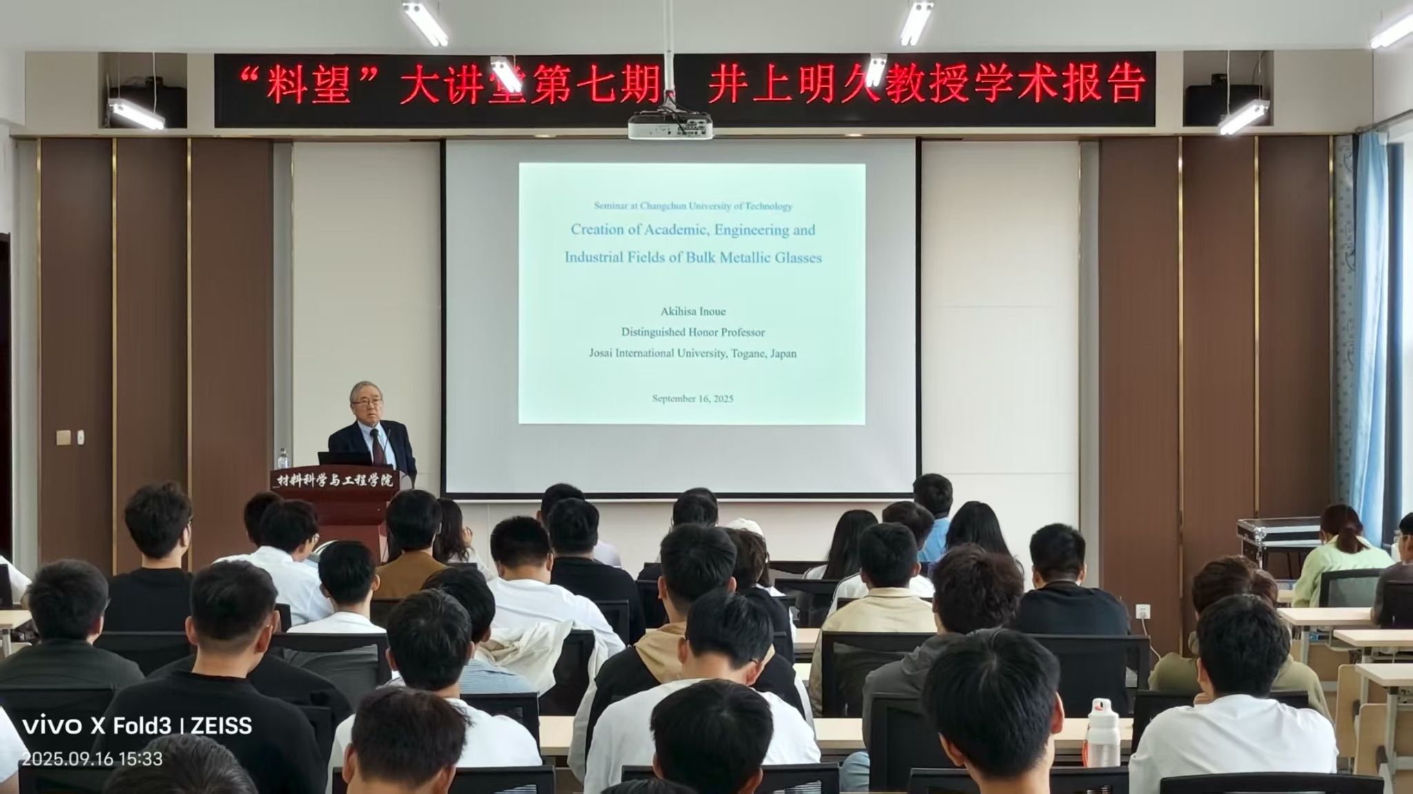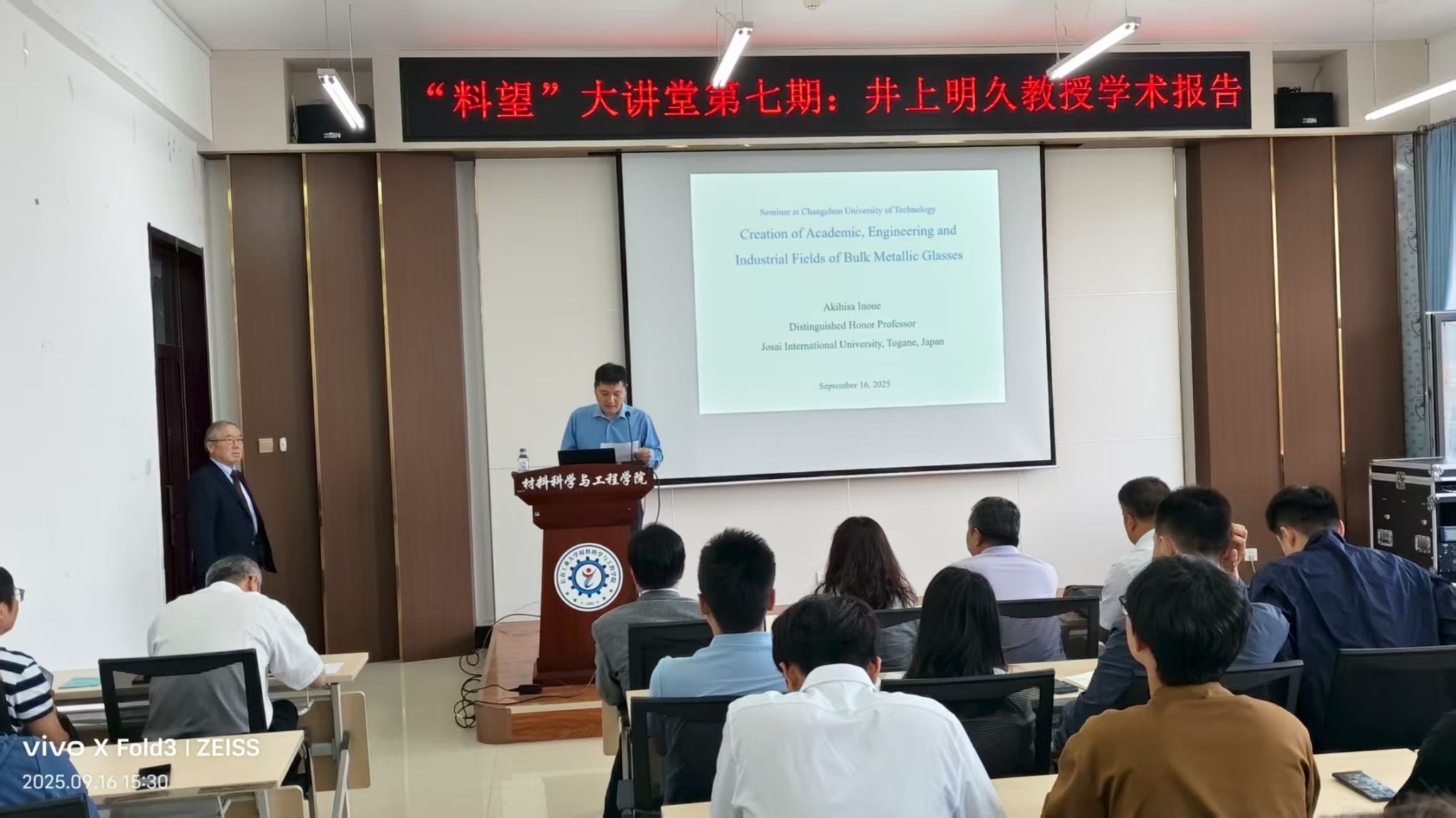 报告会上,井上明久教授从非晶合金的发展历程入手,以Zr基和Fe基块体金属玻璃为例,系统介绍了块体非晶合金的制备方法、结构特性与性能表现,并全面评述了其在生物医学、微电子、移动设备、传感器及磁性材料等领域的应用现状。通过井上明久教授的精彩讲解,有效激发了材料学院青年教师和研究生投身科学研究的热情,对培养材料学科研究生的科研思维具有积极的推动作用。此次学术交流活动也进一步拓展了材料学院的国际合作空间。