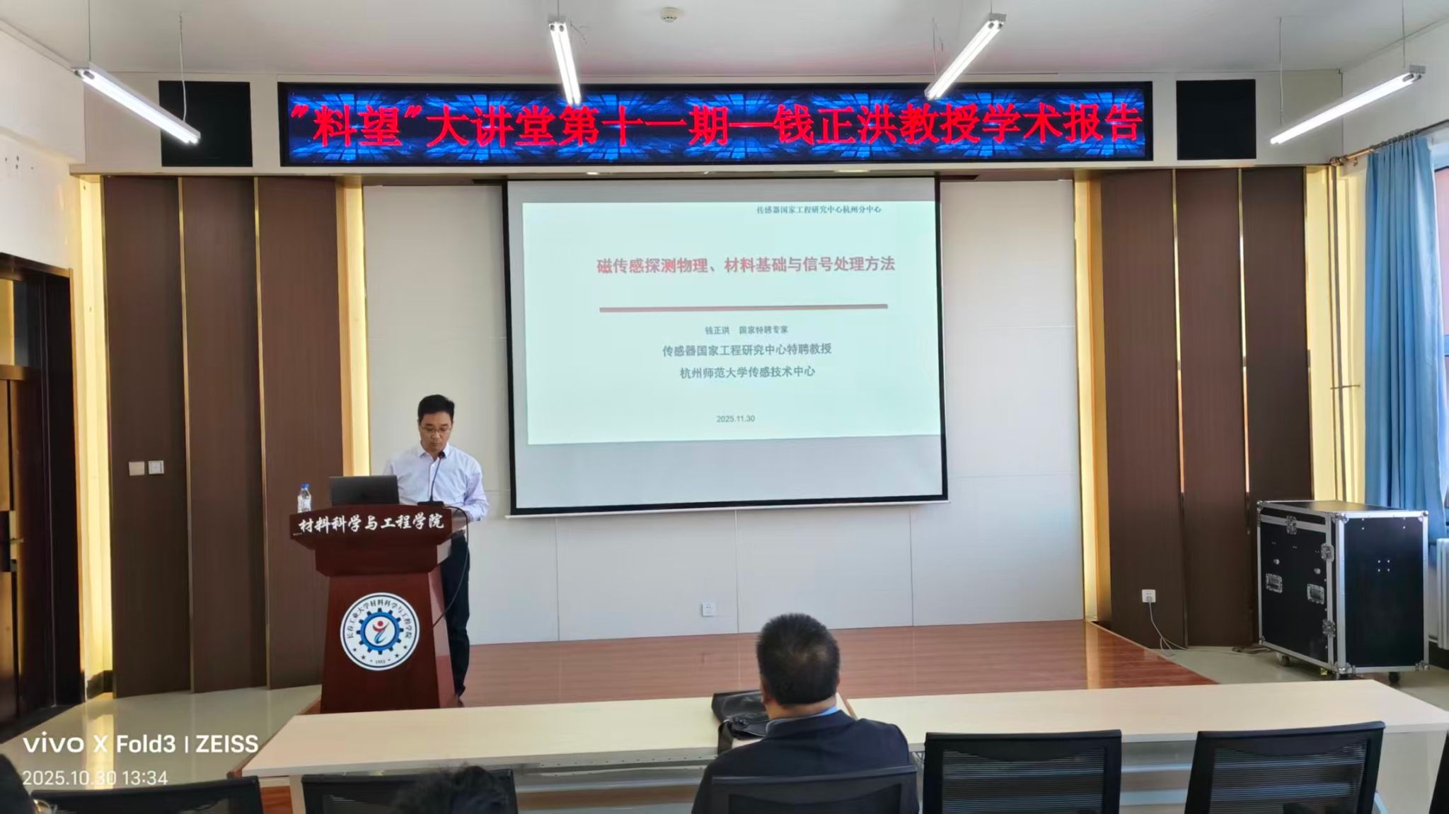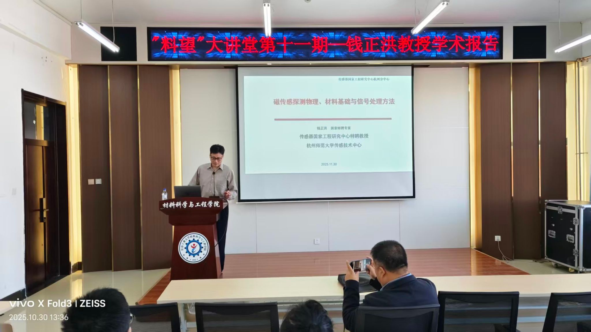 报告会上,钱正洪教授系统的介绍传感器的分类及智能化传感器发展趋势,并探讨我们认识宏观和微观世界的理论基础以及相应的传感与测量手段。同时介绍敏感材料基础、传感器信号调理与数据融合处理方法如卡尔曼滤波、梯度下降算法、AI神经网络等,并探讨磁信号的探测及精确处理技术。结合杭州师范大学传感中心在距离、角度、电流、姿态等传感器的研究成果,讲述磁传感器的设计、制备、系统集成以及在科学研究与新能源汽车等产业化领域中的应用。此次学术报告也有效促进了材料学院与杭州师范大学之间的交流,为后期双方的进一步交流及合作奠定了基础。