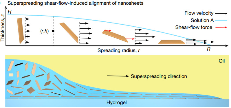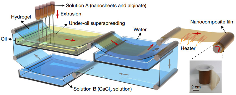 为解决上述难题,赵创奇所在的北京航空航天大学化学学院刘明杰教授课题组提出了基于极稀反应溶液的液体超铺展制备策略。该研究发展了一种基于液体超铺展制备层状结构复合膜制备的新方法,解决了层状结构复合材料无法大面积连续制备的难题。并提出了无机纳米限域空间内高分子链的运动受限是导致复合材料超高力学性能的科学机理。该工作为仿生材料的结构设计及大规模生产提供了新的解决途径