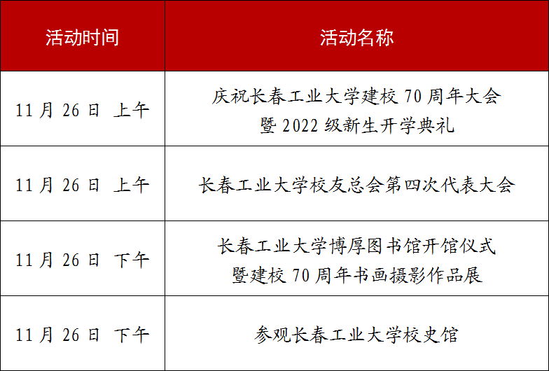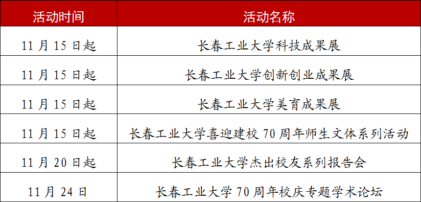发展历程中的一件大事,是全体长春工大人畅叙情谊的盛会,更是凝聚力量、共谋发展的重要契机。站在新的历史起点上,学校将围绕“展示成就,凝聚力量,赓续辉煌”主题,以线上为主的方式,举办校庆系列活动。现公布如下: